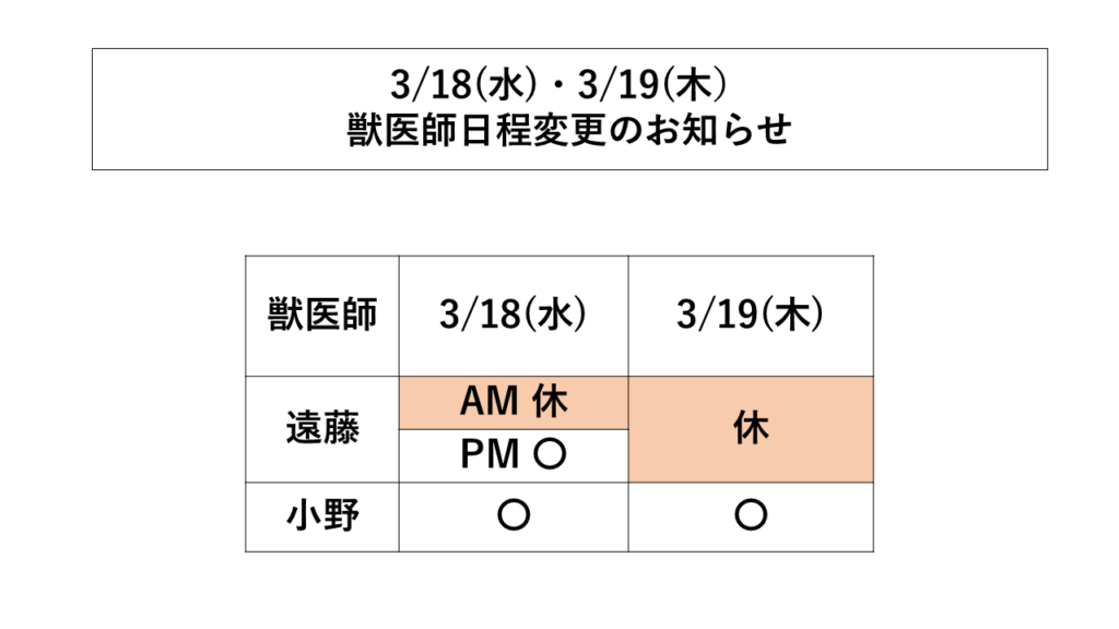 ●3/18(水)・3/19(木)獣医師変更のお知らせ